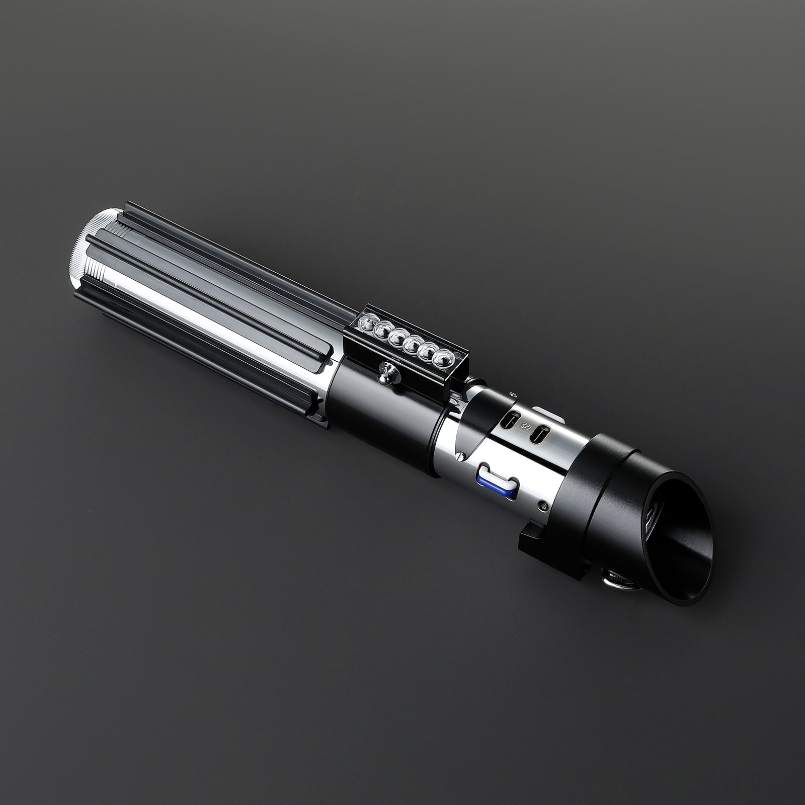 Su empuñadura metálica negra y plateada reproduce fielmente el diseño clásico del Lord Sith, combinando elegancia con una sensación de poder absoluto.