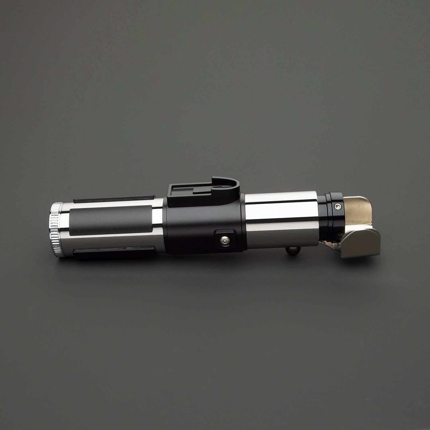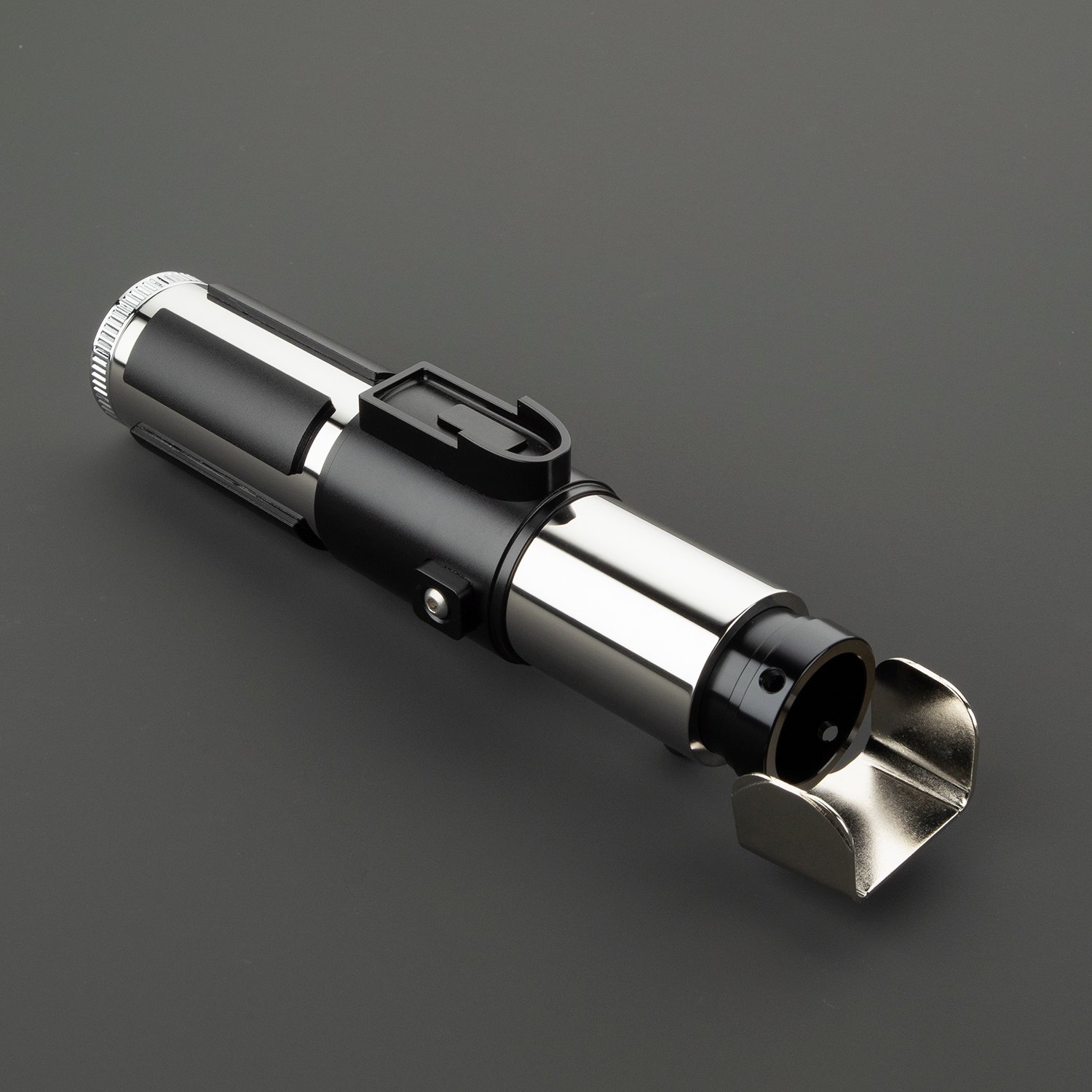 Su empuñadura metálica plateada con detalles negros ha sido recreada con precisión artesanal, manteniendo la fidelidad al diseño original visto en las películas.